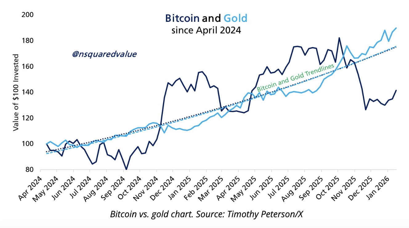 Nhà kinh tế mạng Timothy Peterson lưu ý rằng Bitcoin và vàng vẫn giữ mối quan hệ cấu trúc dài hạn, ngay cả khi hiệu suất ngắn hạn khác nhau.