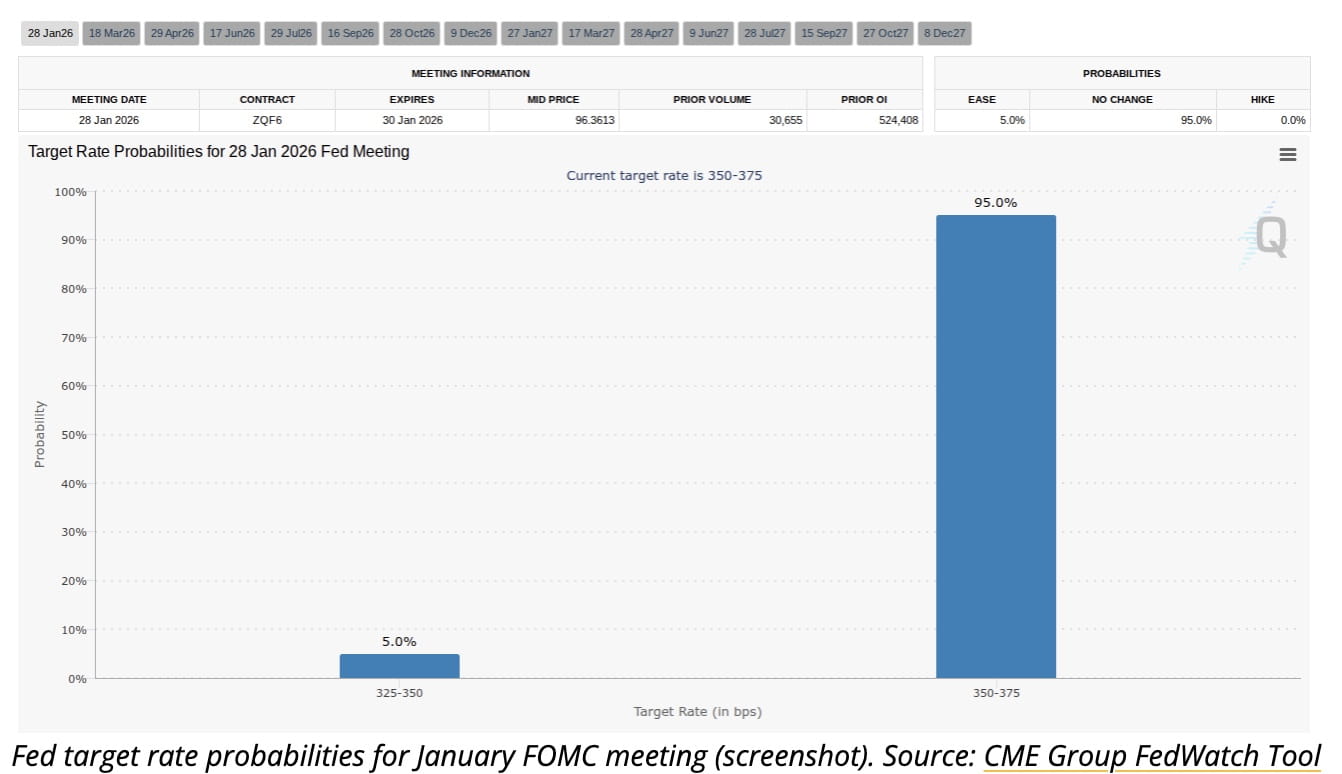 Thị trường hiện tại đang định giá không có cắt giảm lãi suất tại cuộc họp FOMC tháng 1, loại bỏ một luồng tài chính ngắn hạn cho Bitcoin và các tài sản có rủi ro.
