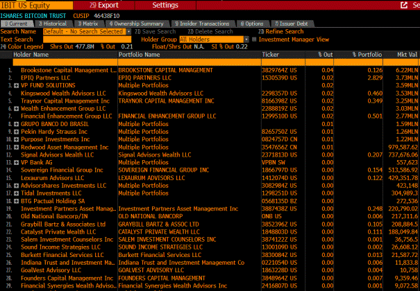Theo Eric Balchunas, khoảng 30 nhà quản lý quỹ (chủ yếu là các quỹ và chuyên gia tư vấn) đã đầu tư vào IBIT. Mặc dù con số này hiện chỉ chiếm 0,2% số cổ phiếu đang lưu hành nhưng Balchunas tin rằng đây chỉ là “phần nổi của tảng băng chìm”, cho thấy tiềm năng chấp nhận rộng rãi hơn và tăng mức độ sở hữu.