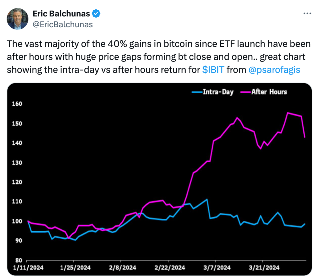 Nhà phân tích Eric Balchunas của Bloomberg ETF cũng lưu ý rằng “phần lớn mức tăng 40%” của Bitcoin kể từ khi Bitcoin ETF giao ngay được giới thiệu vào ngày 11 tháng 1 xảy ra ngoài giờ giao dịch của thị trường Mỹ.