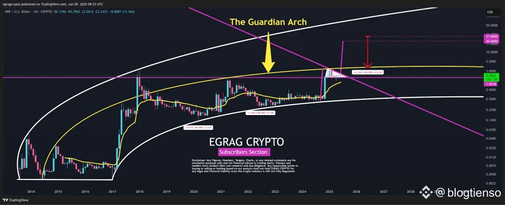 Theo nhà phân tích EGRAG CRYPTO , “Guardian Arch” là dự báo giá dài hạn cho XRP, chỉ ra khả năng tăng giá tiềm năng lên 20–27 đô la. Dự báo này dựa trên phân tích theo thời gian và cấu trúc, với giả định XRP duy trì được đà tăng giá theo thời gian.
