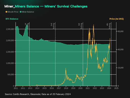 Thợ đào phải đối mặt với những thách thức sinh tồn khi sự kiện halving xảy ra, làm cạn kiệt đáng kể số dư Bitcoin trong ví của họ. Đợt halving sắp tới xảy ra sau xu hướng bắt đầu từ quý 4/2023, với việc các thợ đào liên tục bán ra. Tuy nhiên, bất chấp việc giảm phần thưởng block, doanh thu của thợ đào phục hồi đáng kể so với thị trường gấu cuối cùng nhờ giá Bitcoin tăng trở lại.