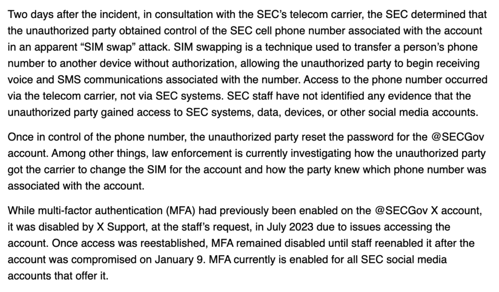 Vào ngày 13 tháng 1 năm 2024, Ủy ban Chứng khoán và Giao dịch Hoa Kỳ (SEC) đã phát hiện ra rằng tài khoản Twitter của họ đã bị xâm phạm. Kẻ tấn công đã sử dụng kỹ thuật hoán đổi SIM để chiếm quyền kiểm soát tài khoản, sau đó họ đã đăng một bài viết giả mạo tuyên bố rằng SEC đã phê duyệt một quỹ giao dịch trao đổi (ETF) giao ngay Bitcoin.