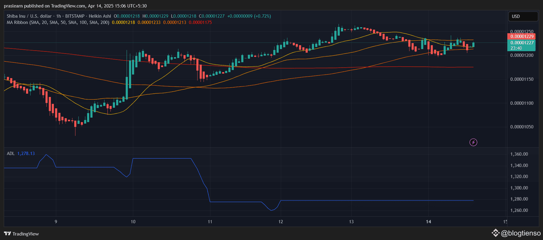 Nhìn vào biểu đồ hàng giờ, hành động này có vẻ hứa hẹn hơn . SHIB đã có xu hướng vượt qua các đường trung bình động chính—SMA 20, 50 và 100 giờ—và vừa vượt qua ngưỡng kháng cự SMA 50 với nến xanh Heikin Ashi sạch.