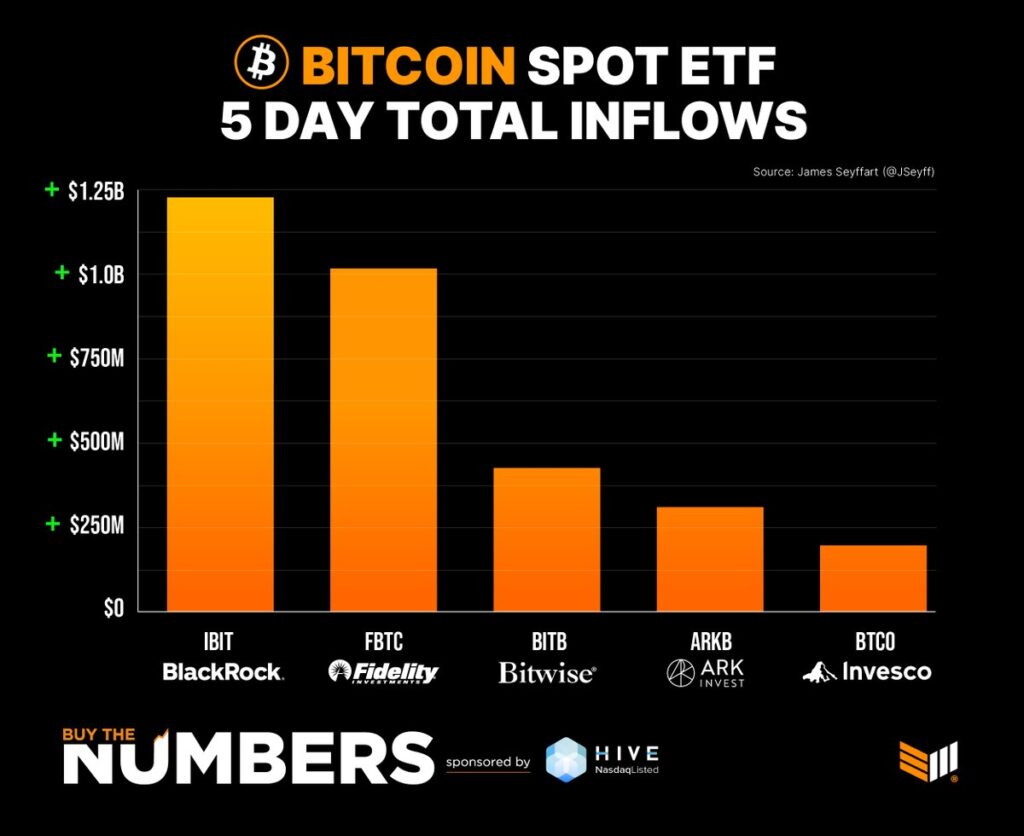 Tổng dòng vốn vào top 5 vị trí Bitcoin tính đến ngày hôm qua:
